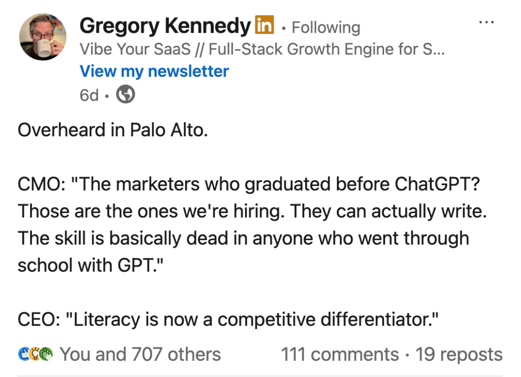 2026 Predictions: The trends that will fly or flop in content marketing As a LinkedIn content strategy coach and agency owner, I spend my days deep in the trenches of content marketing trends. And if 2025 was the year of AI slop – “slop” being Merriam-Webster’s word of the year speaks volumes – 2026 is shaping up to be the year of the correction.We’re about to see the backlash to trends that proliferated in 2025 — overreliance on AI, squeezing marketing teams, betting it all on digital while neglecting other channels. People are tired of the scalable, substanceless content filling their feeds. They are hungry for thought leadership that actually thinks. They also want to touch grass – to flip through a zine, make an in-person connection in a more intimate setting, to get away from their screens.Here are my top 5 predictions.Prediction 1: GEO software companies and agencies will rake in the cash — but they might as well be selling air.We can’t agree on what to call it (I’m going with GEO for Generative Engine Optimization, but some people use AEO for Answer Engine Optimization), but the buzz about optimizing for LLMs is everywhere.In 2026, agencies and SaaS companies will continue to sell it as the new frontier, promising to “optimize” your content so the likes of ChatGPT and Perplexity prioritize your brand over competitors. They’ll make boatloads of cash doing so. But don’t buy the hype just yet. Allow me the honor of saving you some budget. The GEO “science” being sold right now is mostly guesswork that relies heavily on correlation, not causation. There’s not nearly enough evidence to say “THIS is how we optimize for LLMs.”We do know that LLMs rely on ranked URLs. What we don’t know is how they judge the content they find and determine what to include or exclude in a generated response to a user. This “interpretability” factor is one that even the most prominent AI leaders don’t understand. So we can’t “optimize” that process. GEO is…SEOAll that we really know about GEO shows that traditional SEO methods ALSO seem to work for LLM optimization. That’s because tools like Perplexity and SearchGPT use a method called RAG (Retrieval-Augmented Generation). The AI searches the web to find the top 10-20 URLs on the topic. Then it generates a response based on summarizing what it finds. If your content isn’t already ranking in traditional search results, the LLM won’t see it. In other words, traditional SEO is hardly dead – it’s more essential. You don’t need a shiny new GEO agency charging you tens of thousands to unlock the secret to appearing in ChatGPT — you need an agency with a proven track record of optimizing content to show up where your ideal client searches (I happen to know one). Here are two claims you’ll hear this year from people and companies touting GEO services, and why I think they’re dubious at best:GEO vendor claim: “We’ve done a lot of research.”The reality: Research on GEO has been largely academic and performed in specific, static environments. Most people point to a single research paper authored by a group of Princeton PhD candidates in 2024. The paper explained the baseline of GEO methodology and claims that optimizing according to their methods can increase visibility by 40%. These methods include:Making information easier for the model to parse and quoteForegrounding statistics and quotations the model likes to reusePresenting claims in citation‑ready structuresIf this sounds like SEO to you, that’s because it essentially is. These are valid methods for optimizing content for ALL kinds of search, including Google, so it’s not surprising that they worked to increase LLM visibility. Some marketing agencies cite their own client case studies as proof that their GEO approach works. But these aren’t objective peer-reviewed studies, they’re A/B testing. While this is helpful marketing data, it’s not the same as cracking the code on the algorithm’s foundational mechanics.GEO vendor claim: “Our AI mention-tracking tools show you how you’ll appear in LLMs.”The reality: We don’t have a fully reliable way to track brand mentions in LLMs. Don’t believe anyone claiming their reporting data is unassailable. LLMs are non-deterministic — you’ll get a different answer every time you ask a question. Current tracking tools run tests like asking a targeted question 10 times, then counting how many times your brand is mentioned and calling that your visibility score. So if you appear 3 out of 10 times, that’s a 30% score. The problem with this is that LLMs adapt to their users. Whether your brand is mentioned will depend on factors such as user history, location, and stated preferences. There is currently no way to test how your version of Claude responds versus your Aunt Sharon’s. Take a single query, like “I need some ideas for cheap, easy dinners I can make in under 30 minutes.” A young, single financial analyst living with roommates in San Francisco will get different responses than a stay-at-home mom of five in Minnesota. Prediction 2: The “replace your writers with AI” pendulum swings back (and then back again)In 2026, we’ll see two contradictory trends play out side by side as the corporate world, in cost-cutting mode, grapples with AI. One group of companies — the first to fire their writers and other creatives in favor of AI in 2025 — will discover that the ROI on purely-AI-written content is low, at best. Another group will, unfortunately, just be getting started on the same expensive (and potentially reputation-damaging) mistake. Cycle 1: The great rehiring begins The early adopters who rushed to fire writers and replace them with AI are now facing a harsh reality: the promised efficiency gains never materialized into business value. This is a fact backed by data. An MIT study, The GenAI Divide, revealed that a staggering 95% of enterprise AI pilots p
